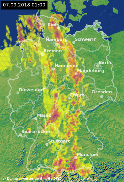 Das Radarbild zeigt aktuell in einer Zone über der Landesmitte, die von Nord nach Süd verläuft teils stärkere Regen- und Schauersignale, vereinzelt blitzt und donnert es auch noch. Sonst präsentiert sich der Himmel über Deutschland sowohl westlich, als auch östlich dieser Zone teils sternenklar, oder nur leicht bewölkt im übrigen Bereich meist wolkenverhangen. Stellenweise haben sich in feuchter Luft Nebelfelder gebildet.