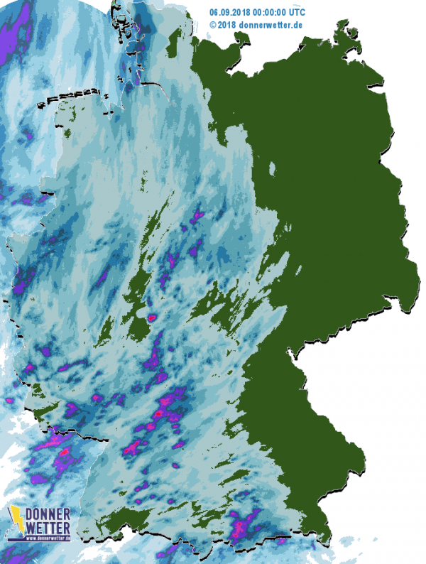 Heute muss im Osten und im Süden noch mit einigen Regenfällen, Schauern und örtlichen Gewittern gerechnet werden, die sich aber im Tagesverlauf allmählich nach Osten entfernen. Auch von Benelux ziehen neue Schauer, vereinzelt auch in Begleitung von Blitz und Donner in den Nordwesten herein. Die Niederschlagsmengen liegen dabei meistens zwischen 1 und 15 Liter pro Quadratmeter. Im übrigen Bereich bleibt es in der Regel trocken bei einer Mischung aus Sonne und Wolken.