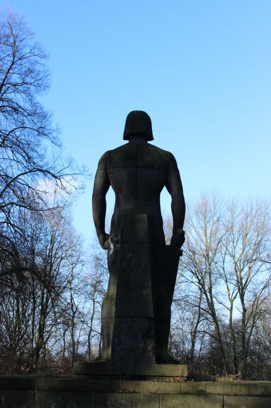 Die Statue zeigt das gewünschte "germanische" Menschenbild (mythologischer Siegfried) der Nazis. Mit ihm sollte das gute Erbgut der Deutschen geschützt werden, um so nach einem falsch verstandenen Darwin nur die "Besten und Guten" überleben zu lassen. So waren es etwa "Behinderte" und andere "Volksschädlinge", die entsprechend der Logik ausgerottet wurden. Merkwürdig, aber dennoch typisch: Der große Führer entsprach mal so gar nicht diesem Ideal, heute empfinden wir diesen Umstand tragerischerweise nur noch als lächerlich.