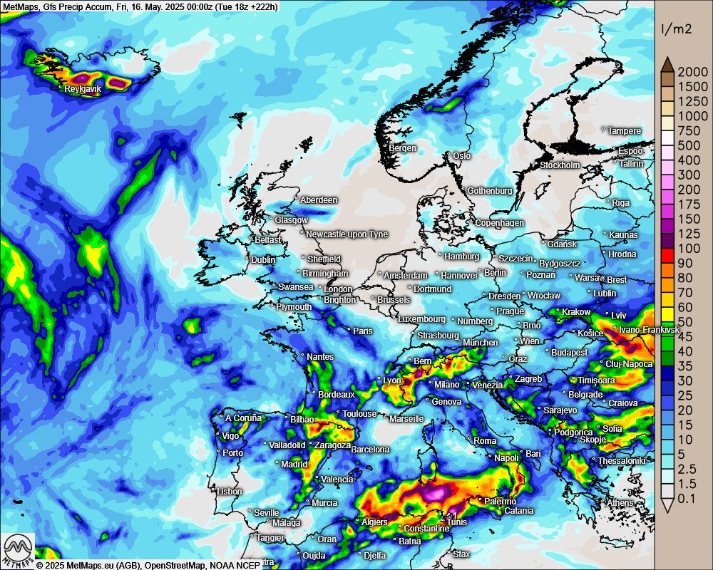 Entsprechend ist auch die Wetterentwicklung der nächsten 10 bis 14 Tage in Deutschland: Uns erwartet über weite Strecken freundliches und trockenes Wetter - nachfolgend zu sehen in den Niederschlagssumen bis zum 16.5.