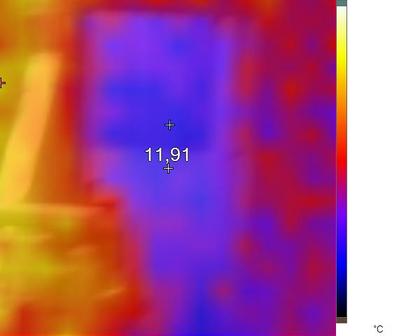 Das folgende Wärmebild zeigt den Donnerwetter.de-Keller (ungeheizt) mit 12-14 Grad C Oberflächentemperatur heute Nachmittag.