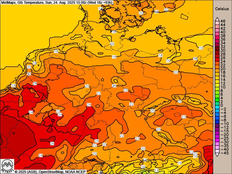 Die letzte Karte zeigt die Nachmittagswerte (15:00 Uhr) am kommenden Sonntag nach GFS.