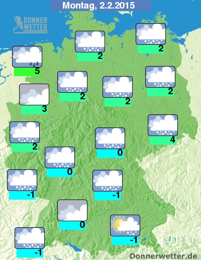 Winterlich startet dann nahezu das gesamte Land in den ersten Werktag des neuen Monats. Allein im äußersten Nordwesten fallen Niederschläge als Regen, sonst verbreitet Schnee oder Schneeregen bei Höchstwerten um -1 bis +4 Grad C.