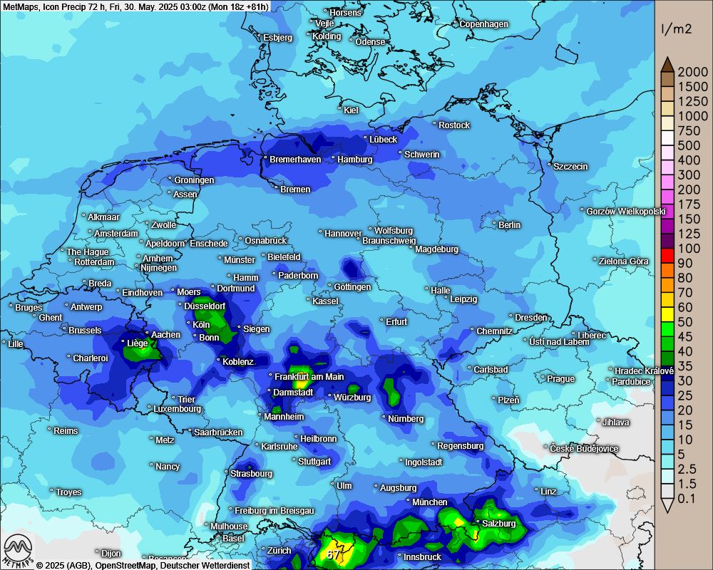 Im Vergleich die recht ähnlichen Berechnungen der 72-Stunden-Regenmengen von ICON und GFS bis Freitag.