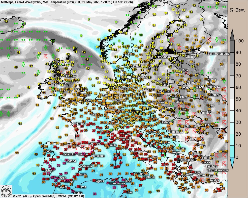 Wetter- / Temperaturkarte Samstag, 31.05. (ECMWF)
