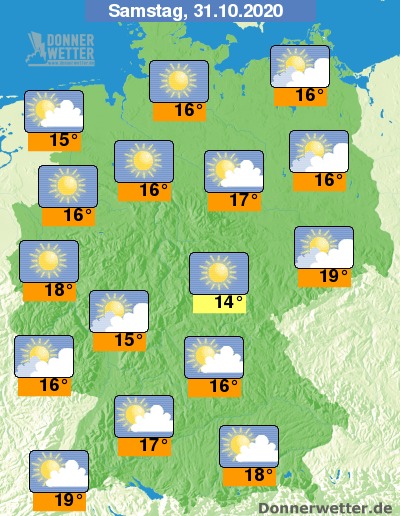 Am Sonntag (Allerheiligen) steigt im Norden und Westen Deutschlands das Schauerrisiko wieder an. Überwiegend freundlich und trocken kann der Süden und Osten dagegen die Woche ausklingen lassen. Die Höchstwerte liegen nahezu unverändert zum Vortag bei Werten um 14 bis 18 Grad.