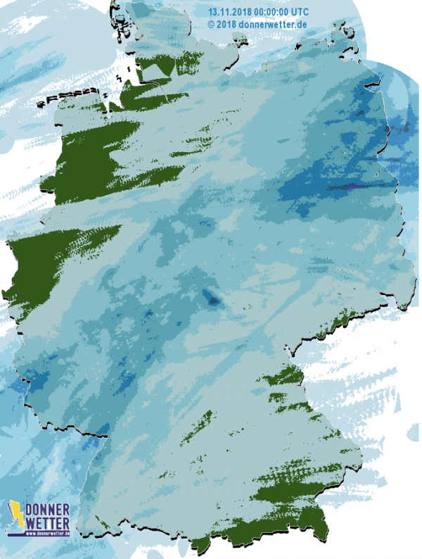 Das Radarbild zeigt aktuell ganz im Norden noch einige leichte Signale mit etwas Regen oder örtlichen Schauern. Sonst präsentiert sich der Himmel über Deutschland teils bewölkt, teils aufgeklart. Regional haben sich bereits schon Nebelfelder gebildet.