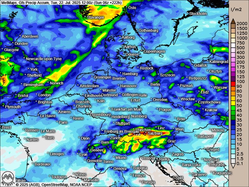 Die Tageswerte nach GFS am kommenden Freitag (18.07.) sowie die Regenmenge bis zum 22.7. nach GFS.