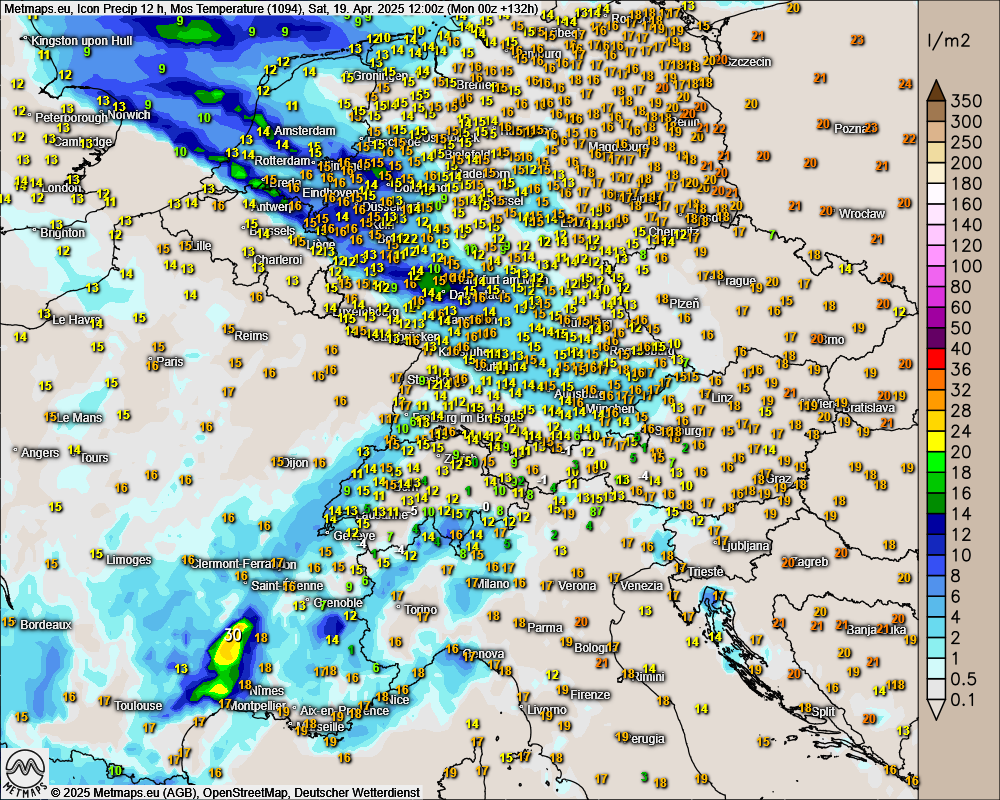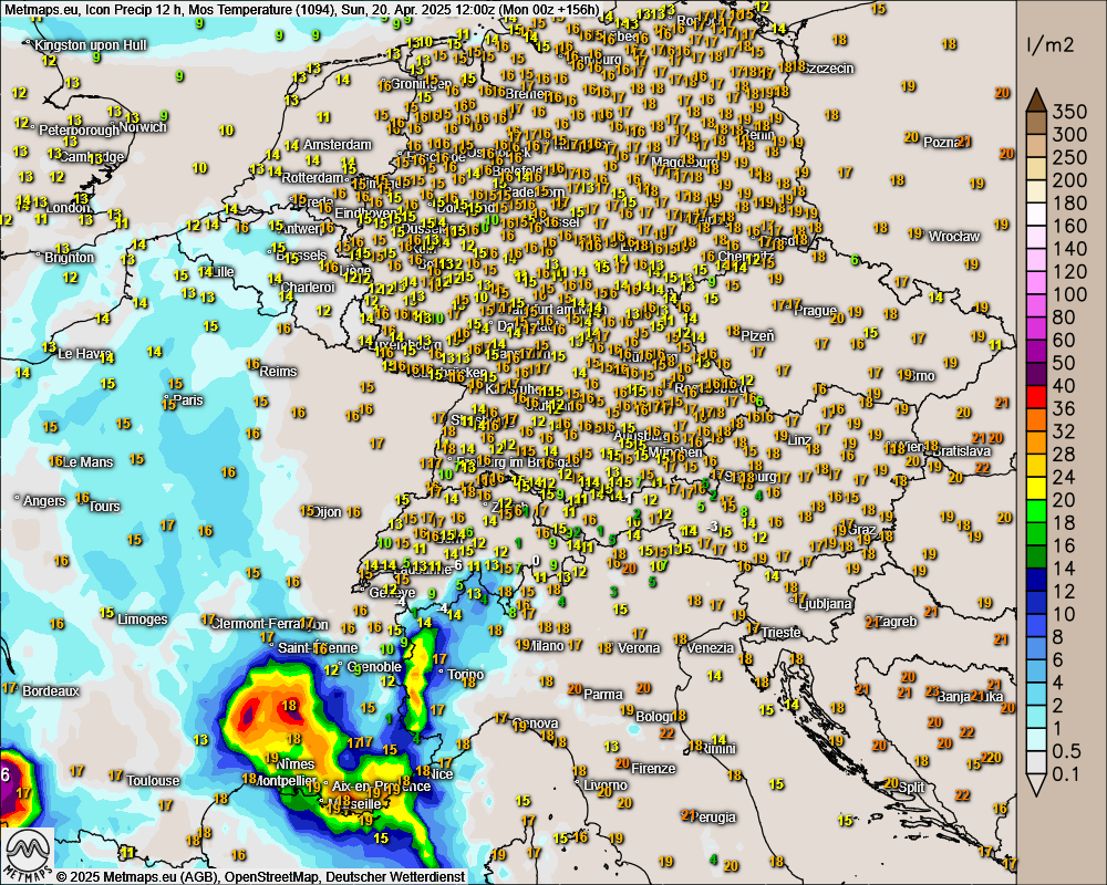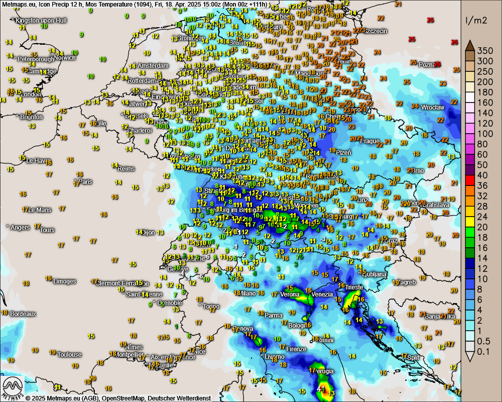 Vor allem wer die Karwoche in Norditalien oder der südlichen Schweiz verbringen wird, sollte maximal regenfest sein: Bis Karfreitag muss hier mit unwetterartigen Regenmengen (je nach Modelllauf zwischen 300 und 400 l/m²) und kräftigen Gewittern gerechnet werden. Hochwasser ist möglich - und zumindest lokal - auch Sturzfluten.