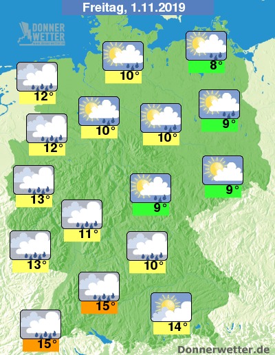 An Allerheiligen macht sich im arbeitsfreien Süden und Westen zwar etwas mildere Luft bemerkbar; der Temperaturanstieg ist jedoch mit vielen Wolken verbunden und immer wieder muss im Tagesverlauf mit Regen gerechnet werden. Im Nordosten dominieren am Freitag noch kühlere Luftmassen und die Sonne kommt hier noch häufiger zum Zug.