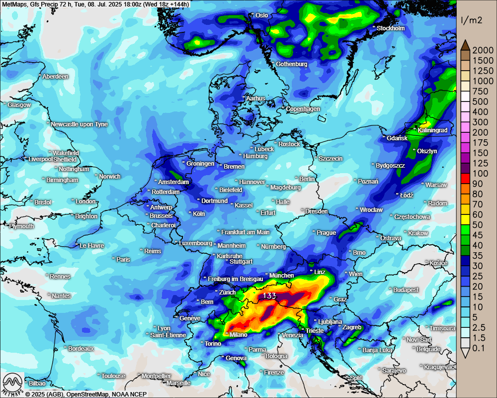 Die Karte zeigt die akkumulierten Niederschlagssummen bis kommenden Dienstag, 08.07. (18 Uhr) nach GFS: Unter anderem für Teile Brandenburgs und Sachsens, gerade hier wüten zur Zeit viele Waldbrände, geht das Modell bis zum Stichtag von komplett trockener Witterung aus.
