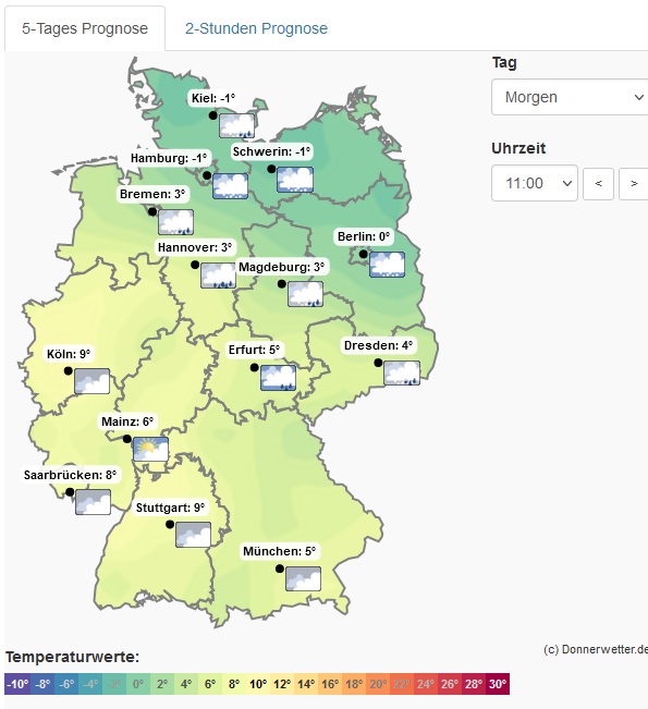 Kalte Luft aus Skandinavien verdrängt nun zunehmend die milde Atlantikluft - wie über unser Nowcasting zu sehen, macht sich der Temperaturfall zunächst vor allem im Norden und Nordosten Deutschlands bemerkbar.