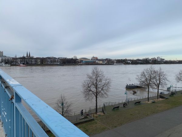 Bereits jetzt ist der Rhein gut gefüllt - die Pegel werden in den kommenden Tagen, bedingt durch die teils ergiebigen Regen- und Schneefälle, aber noch weiter ansteigen.