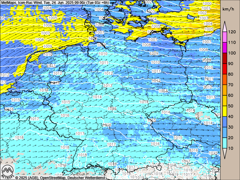 Die Böenkarte nach ICON-RUC von Dienstagfrüh: