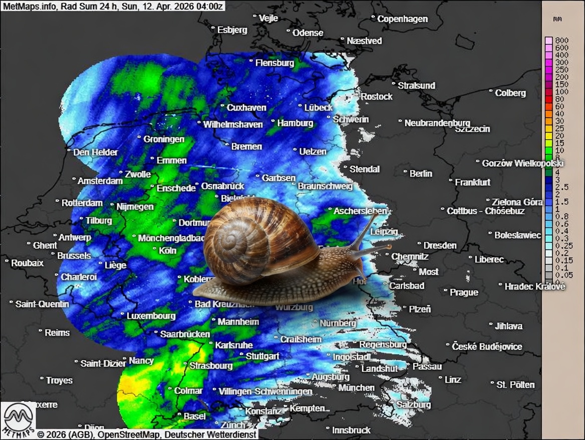 Hier die 24 Stunden Radarregenmenge und die Regenmenge mit den Temperaturen für den bescheidenen Sonntag.