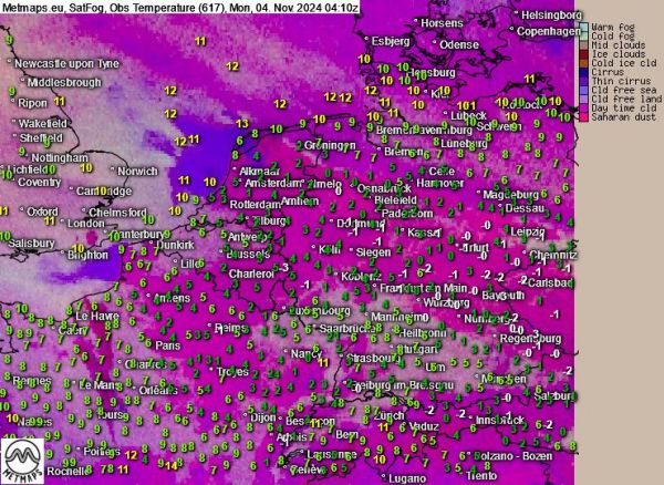 Die SatFog-Nebelanalyse von Meteosat (5.10 Uhr) mit den beobachteten Temperaturen.