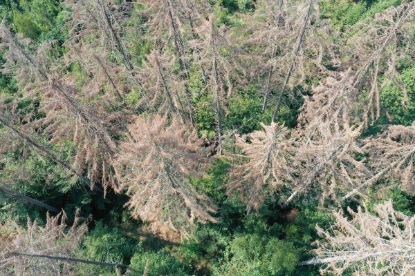 Den Fichten auf unserer Drohnenaufnahme, aufgenommen in einem Waldstück bei Bonn, ist nach dem Sommer 2019 wohl nicht mehr zu helfen.