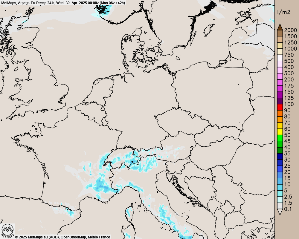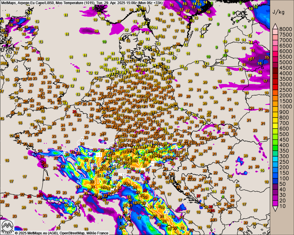 Nachfolgend zu sehen sind die CAPE/LIFTED Karten des ARPEGE-EU-Modells; die farbigen Bereiche markieren Instabiliät und den Aufstieg großer Luftpakete heute Nachmittag. In diesen Bereichen können sich Schauer und Gewitter bilden.