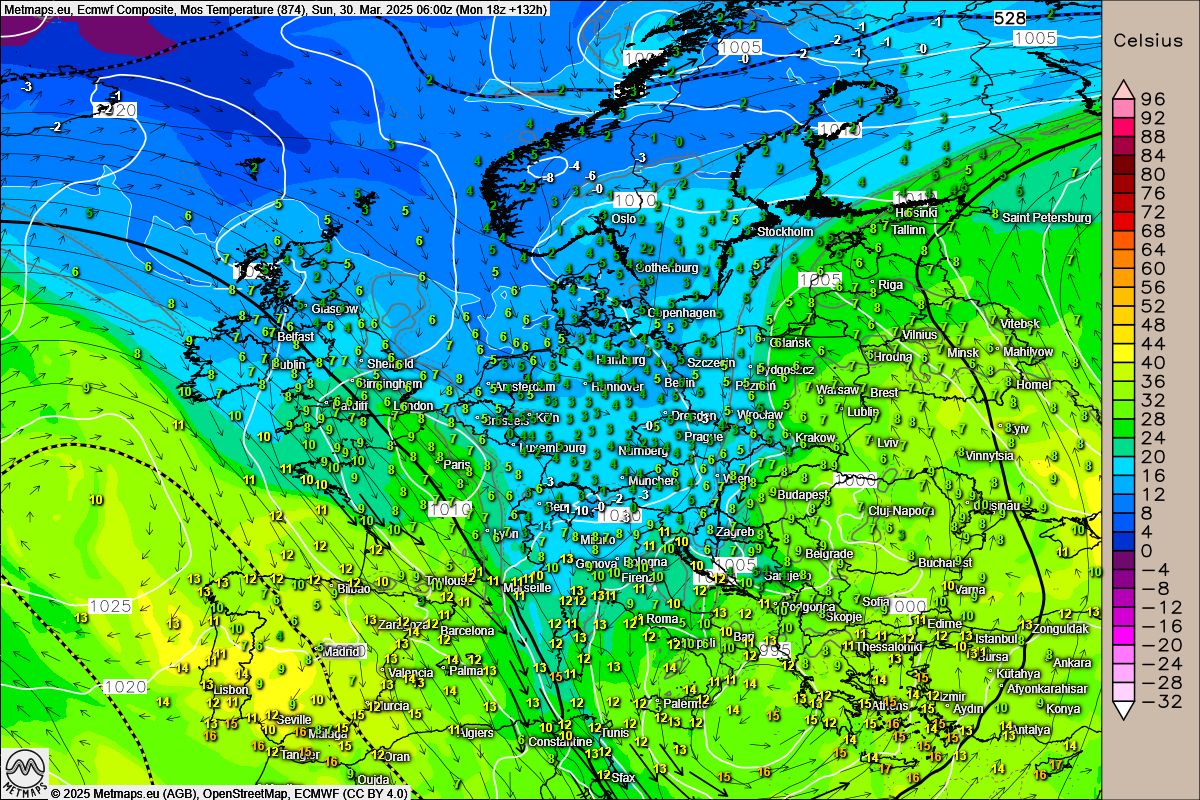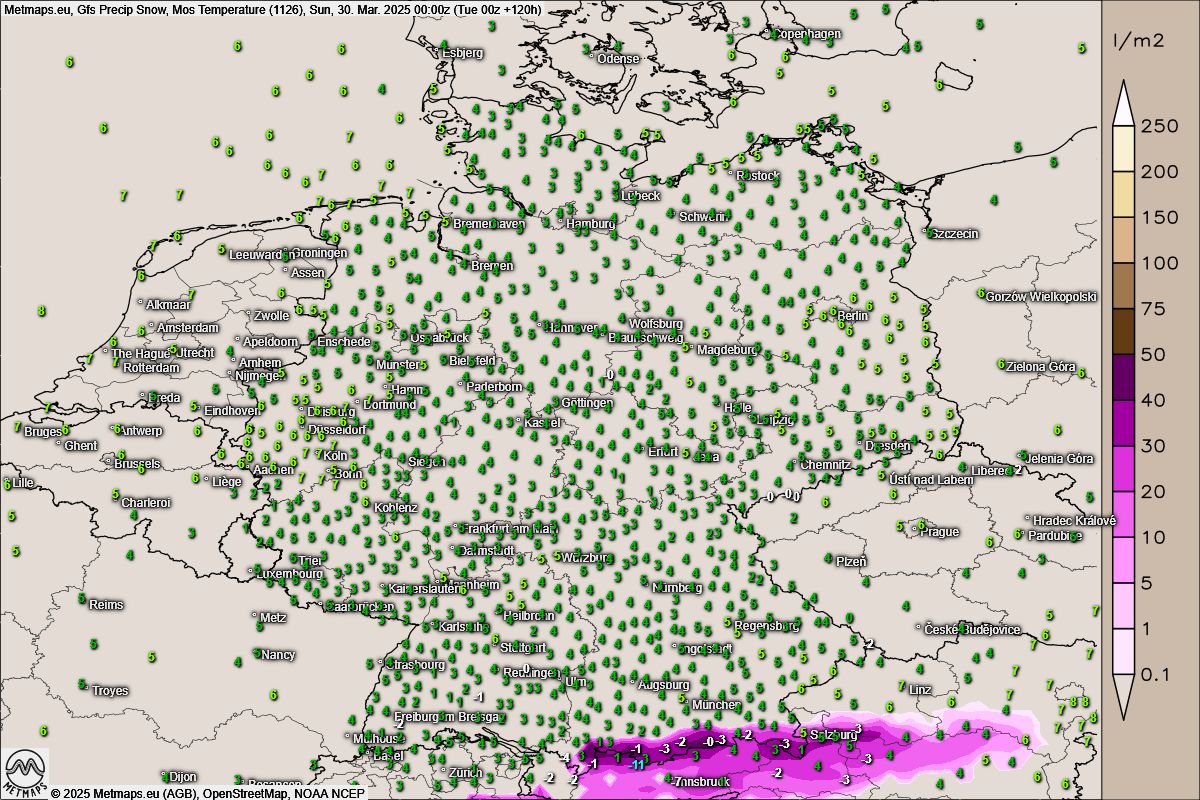 Die Temperaturen erreichen bei uns dann nur noch Werte um 10 bis 12 Grad C tagsüber, in den Nächten geht es auf 3 bis 0 Grad herunter. Verbreitet muss mit Bodenfrost gerechnet werden.