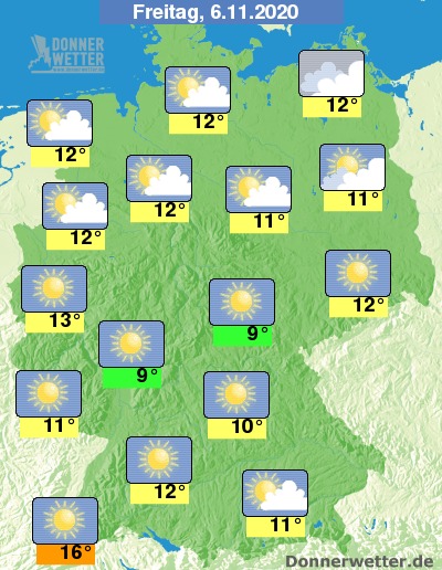 Am Freitag kann vor allem die gesamte Südhälfte das Wochenende bei meist strahlendem Sonnenschein gebührend einläuten. Im norddeutschen Tiefland wechseln sich Sonne und lockere Wolken ab. Schauer gibt es nicht, dafür Höchsttemperaturen um 9 Grad im Spessart und bis 16 Grad am Hochrhein.