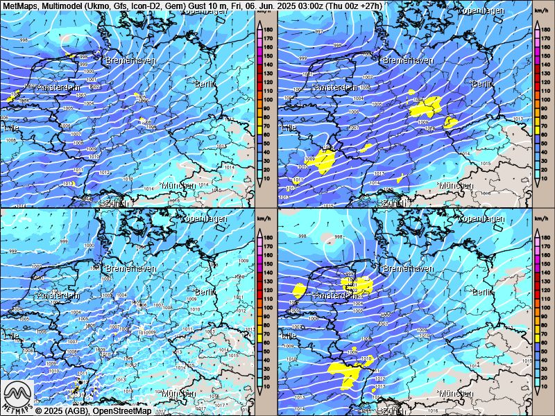 Multimodell Windgeschwindigkeiten 10 m, 06.06. (03:00 Uhr)