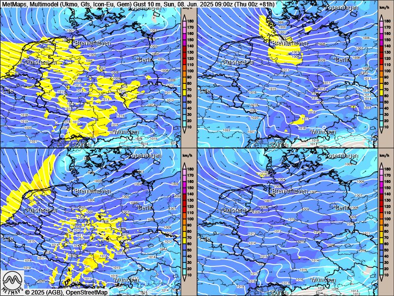 Multimodell Windgeschwindigkeiten 10 m, 08.06. (09:00 Uhr)
