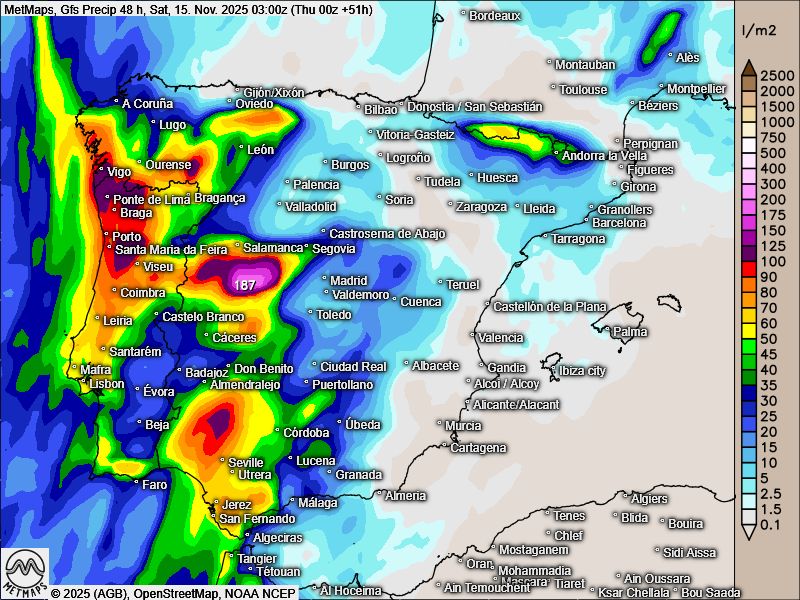 Weit entfernt von ruhigem und freundlichem Novemberwetter sind hingegen Spanien und Portugal. Hier drohen heute und am Freitag Sturm und Starkregen durch Tief "Pepe" (international: "Claudia").