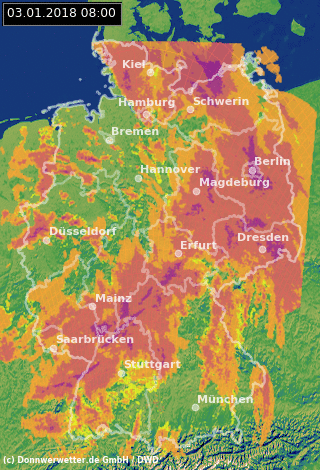 Die Westhälfte des Landes hat das Hauptsturmgebiet überstanden, in den kommenden Stunden liegt der Schwerpunkt auf der Südwesthälfte. In Baden-Württemberg und Teilen Bayerns können dann mit Durchzug der Kaltfront örtlich schwere Sturmböen, regional auch Orkanböen auftreten. Um die Mittagszeit erreicht das Sturmfeld den Alpenrand.