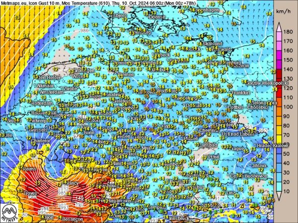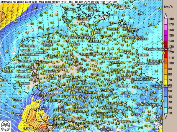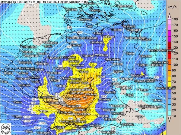 Nach aktuellem Stand sind Spitzenwindgeschwindigkeiten von 90 bis 110 km/h am Donnerstag in Teilen von Rheinland-Pfalz, dem Saarland, Baden-Württemberg, Bayern, und Hessen zu erwarten. Mit einem etwa nördlicheren Verlauf könnte auch NRW betroffen sein. Schäden durch die meist noch belaubten Bäume sind wahrscheinlich.