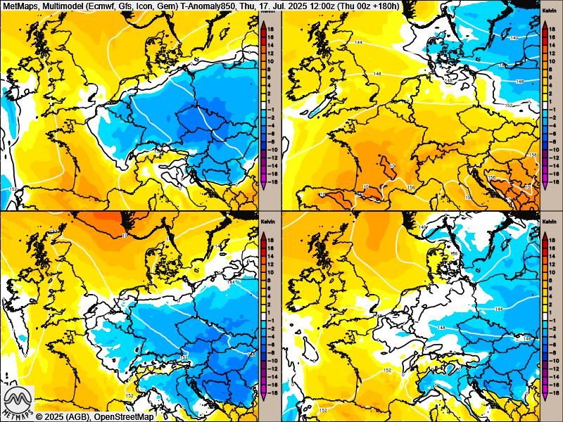 Die ersten beiden Karten zeigen die Ensembles vier verschiedener Modelle mit dem Luftdruck am Freitag und der Regenmenge am Samstag. Die dritte Karte bildet die zögerliche Erwärmung in der nächsten Woche / die 850 hPa-Temperatur-Anomalie ab.
