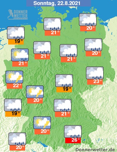 Nach Höchstwerten um 23 bis 28 Grad am Samstag klettert das Thermometer am Sonntag verbreitet nur noch auf Temperaturen um 19 bis 23 Grad. Der Augstsonne von Samstag geht auch wieder schnell die Puste aus, stattdessen gibt es meist dichte Wolken, teils kräftigen Regen und lokale Gewittergüsse.
