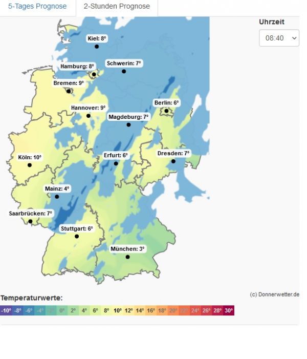 Die Karte zeigt die Lufttemperaturen um 08:40 Uhr in Deutschland über unser Nowcasting - lokal herrschen aktuell bereits zweistellige Plusgrade.