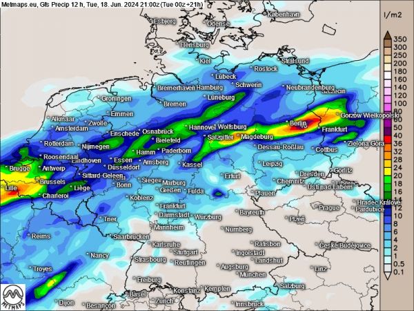 Einerseits ist in den nächsten Stunden auf einem Streifen von den Niederlanden über das Münsterland, die Lüneburger Heide und nachts auch in Mecklenburg-Vorpommern mit gewittrigem Dauerregen zu rechnen.