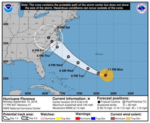 Die folgende Grafik zeigt die voraussichtliche Zugbahn von "Florence". Erstmals auf Festland trifft der Sturm demnach am kommenden Donnerstagabend (AST). Besonders betroffen wäre zunächst die Küste North Carolinas.