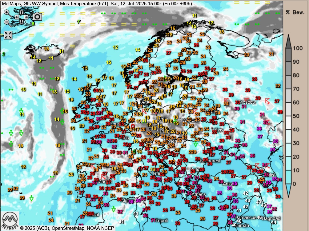 Wen es an den Strand und in die Wärme zieht, findet nahezu in ganz Südeuropa bei Werten um 32 bis 35 °C, auf Teilen des spanischen Festlandes sogar Werte um 38 Grad C, bestes Badewetter vor.