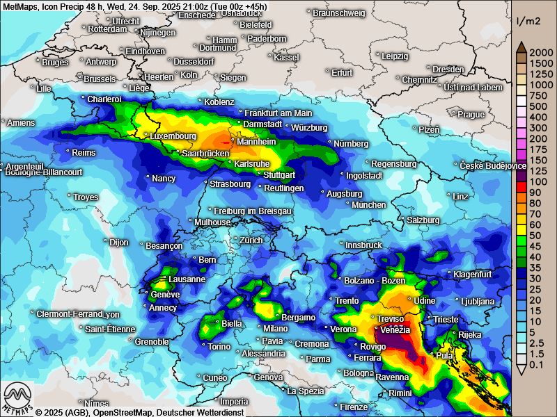 Sehr viel Regen gibt es bis Mittwochabend aber auch im Saarland, im Norden Baden-Württembergs sowie bei unseren Nachbarn in Luxemburg - hier können binnen 48 Stunden bis zu 80 l/m² herunterkommen.