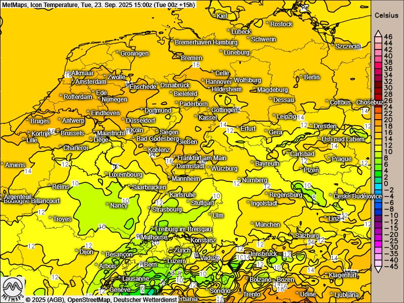 Die Temperaturen sind zudem ziemlich verhalten und erreichen im Südwesten nur noch Werte um 12 Grad in Stuttgart und 13 Grad C in Mannheim.