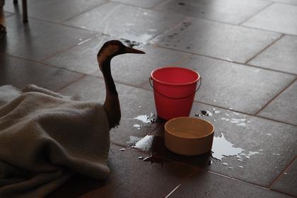 Am Sonntagmorgen lag unweit des Donnerwetter.de Klimaparks ein verletzter Kranich auf der Wiese. Nach zwei Nebeltagen gibt es hier in den Eifel zahlreiche verletzte Kraniche zu vermelden. Er konnte seine Flügel kaum bewegen und blutete schon leicht. Mit einer Decke bewaffnet wurde das Tier zu zweit in die Ausstellungshalle von Donnerwetter.de verbracht. Der Transport von einem Kranich ist nicht ganz einfach, da der Schnabel picken kann, was erhebliche Verletzungen im Gesicht verursachen kann. Es ging aber alles gut.