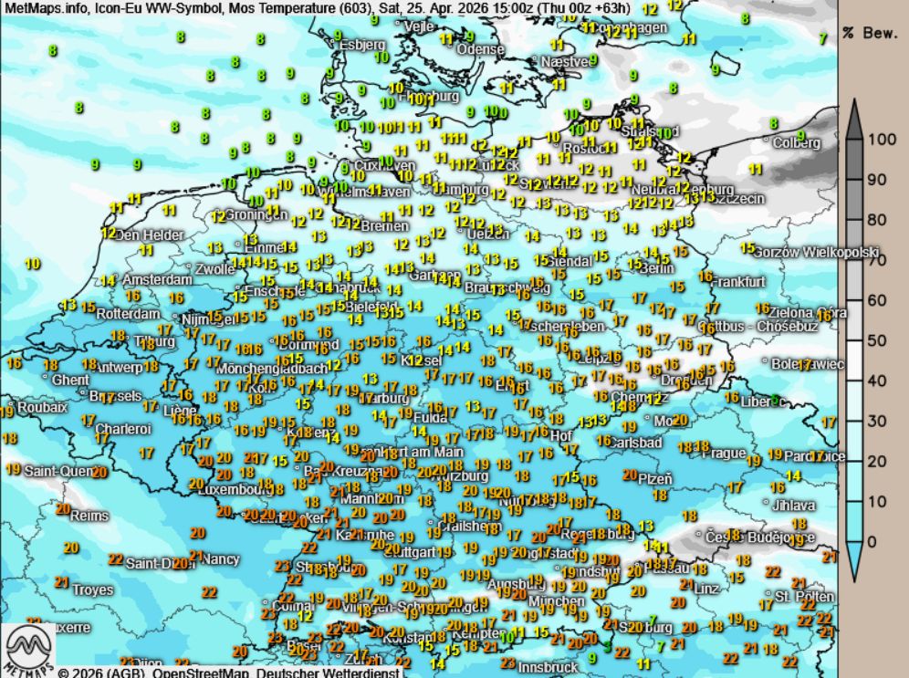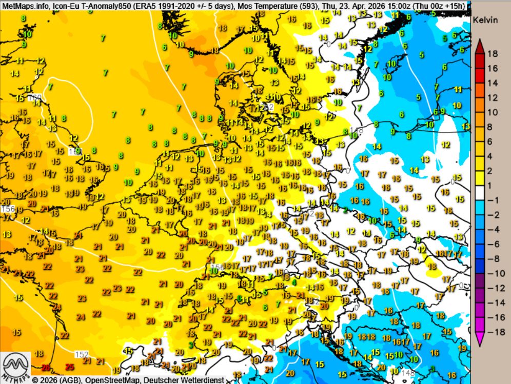 Sehr schön sieht man diese großflächige Warmluftzufuhr auf der aktuellen Europakarte, die ein markantes Temperaturgefälle zwischen dem noch kühlen Skandinavien und dem sich zügig erwärmenden Mitteleuropa zeigt: