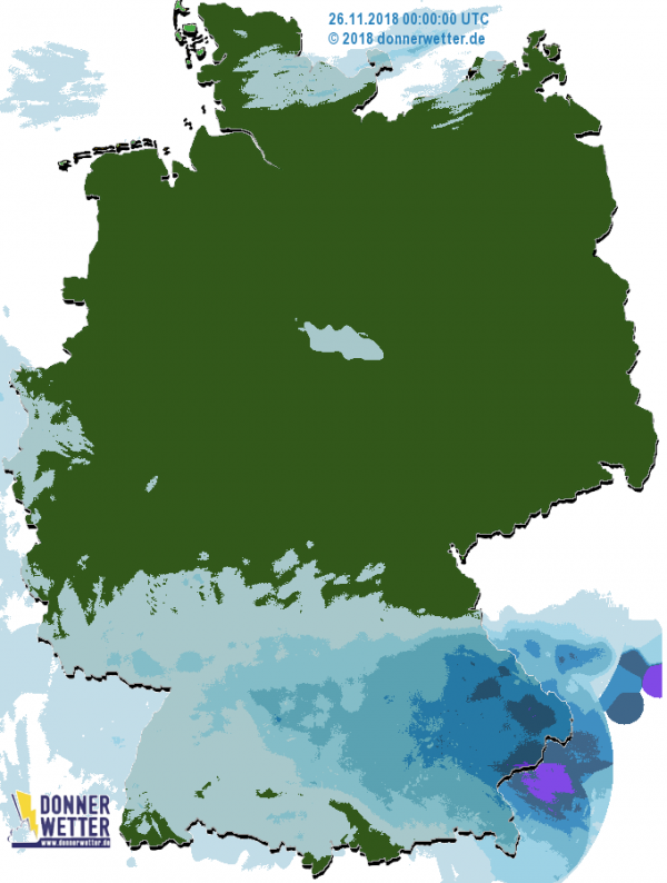 Heute fällt zunächst im Süden und Südwesten, später nur noch südlich der Donau Regen oder Schnee. Im Alpenvorland wird es winterlich. Die Niederschlagsmengen liegen dabei meist zwischen 1 und 10 Liter pro Quadratmeter. Im übrigen Land bleibt es meistens trocken aber trübe mit nur regionalen sonnigen Plätzen.