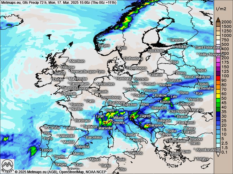 Zum Wochenende wandert das gute Wetter in den Süden, der Regen zieht über die Alpen ab. Nachfolgend eine Übersicht der 72 Stunden-Regenmengen bis kommenden Montag (17.03.2025):