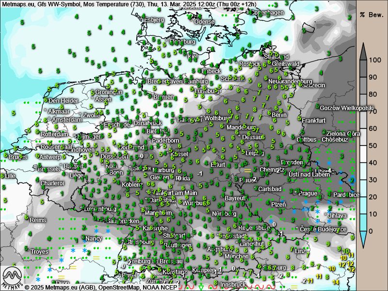 Tagsüber erwartet uns am Donnerstag meist graues Wetter, dazu zeitweise etwas Schneeregen (s. GFS-Karte von Donnerstagnachmittag). Größere Wolkenlücken beschränken sich in erster Linie auf die Nordhälfte Deutschlands.