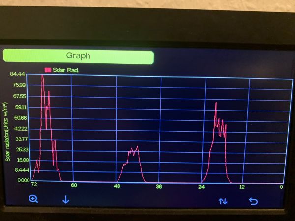 Auf der Aufnahme ist die vorherrschende Globalstrahlung am Mittwoch an unserer Wetterstation in Bonn zu sehen; in der Mittagszeit erreichte sie Höchstwerte von gerade einmal 60 bis 80 W/m².