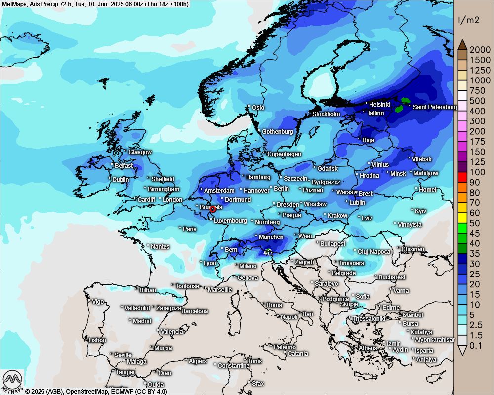 Das verlängerte Pfingstwochenende wird nass und wechselhaft in Mitteleuropa - die Karte bildet die aktuell nach AIFS berechneten 72-Stunden-Regenmengen bis Dienstagmorgen ab: