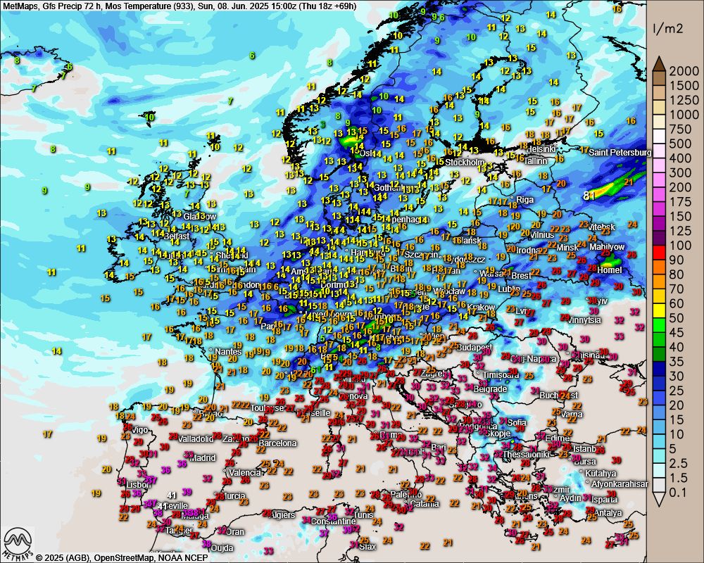 Die Regen- und Temperaturkarte nach GFS für Europa an Pfingstsonntag: