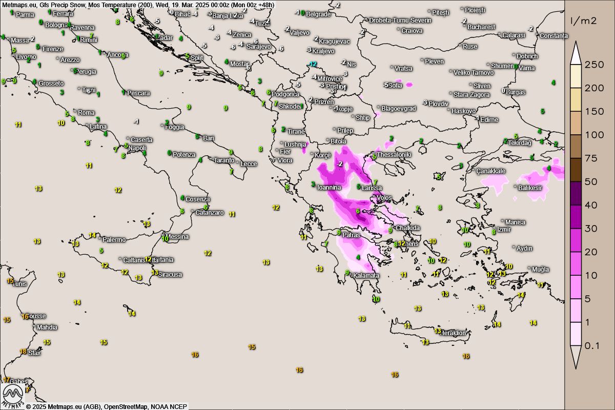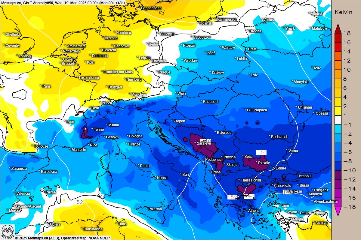 Die Kaltluft rutscht dann in den östlichen Mittelmeerraum ab: Von Temperaturen um 25 Grad in Thessaloniki geht es dann auf Werte wenig über dem Gefrierpunkt.