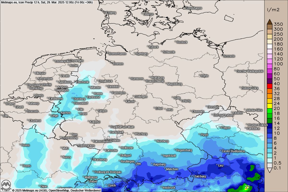 Nach einem in weiten Landesteilen sonnig-mildem Freitag folgt am Samstag eher wolkiges Märzwetter. Die dabei zu erwartenden Regenmengen sind jedoch bescheiden: Vielerorts bleibt es sogar trocken, nur an den Alpen fallen Niederschläge von rund 10 l/m².