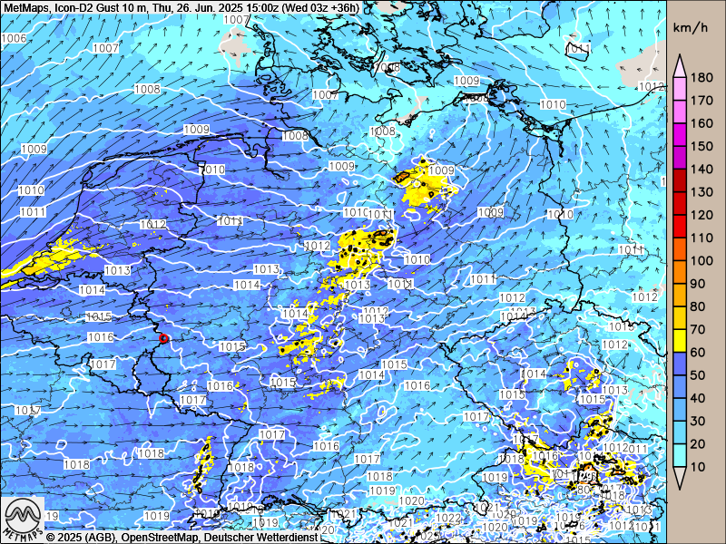 Die Böenkarte (10 m Wind) nach ICON für Donnerstagnachmittag (15:00 Uhr):