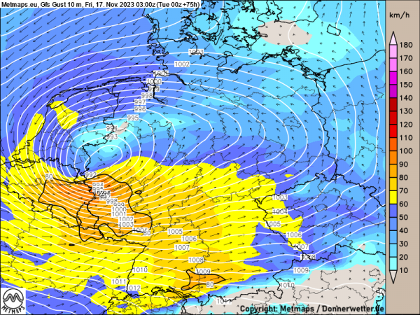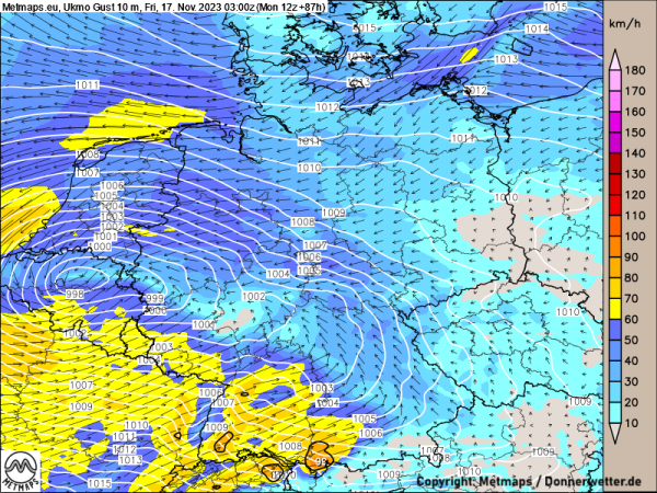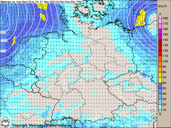 Ein sehr gutes Beispiel hierfür liefern die aktuellen Windprognosemodelle für Freitagfrüh (17.11.2023, 03:00 Uhr).