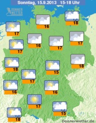 Am Sonntag gibt es dichte Wolken vor allem in Küstennähe und im Süden Deutschlands. In der Mitte und im Westen kann es im Tagesverlauf auch immer wieder mal aufheitern und die Sonne zeigt sich stellenweise. Mit Schauern muss am Sonntag jedoch auch hier gerechnet werden, Höchstwerte um 15 Grad in Bayern und 19 Grad in Mecklenburg.